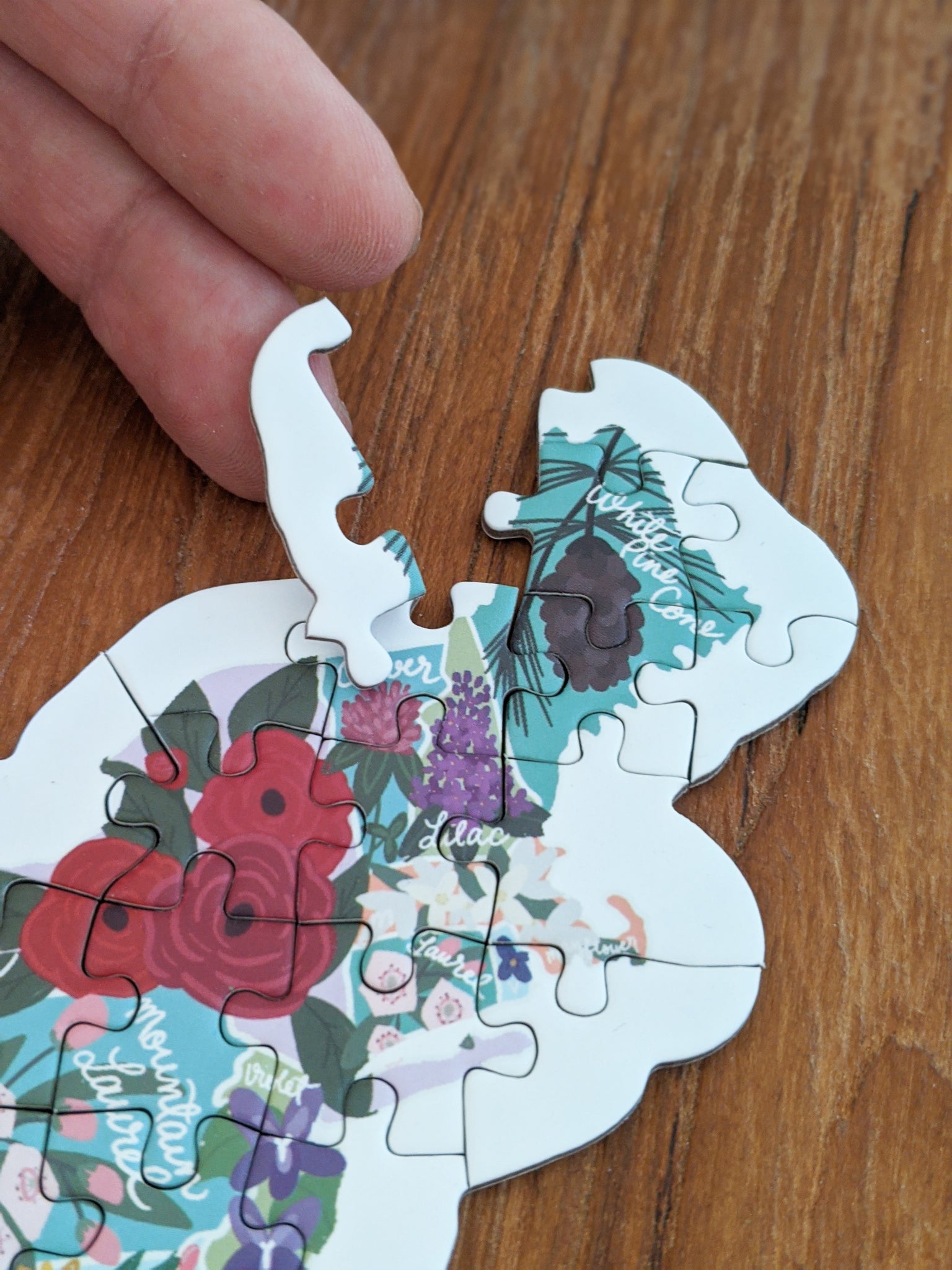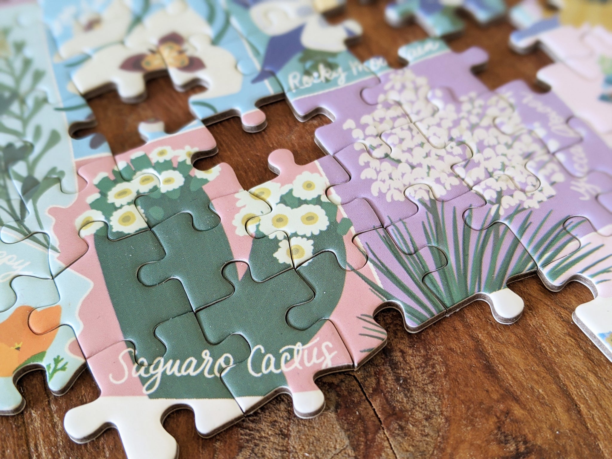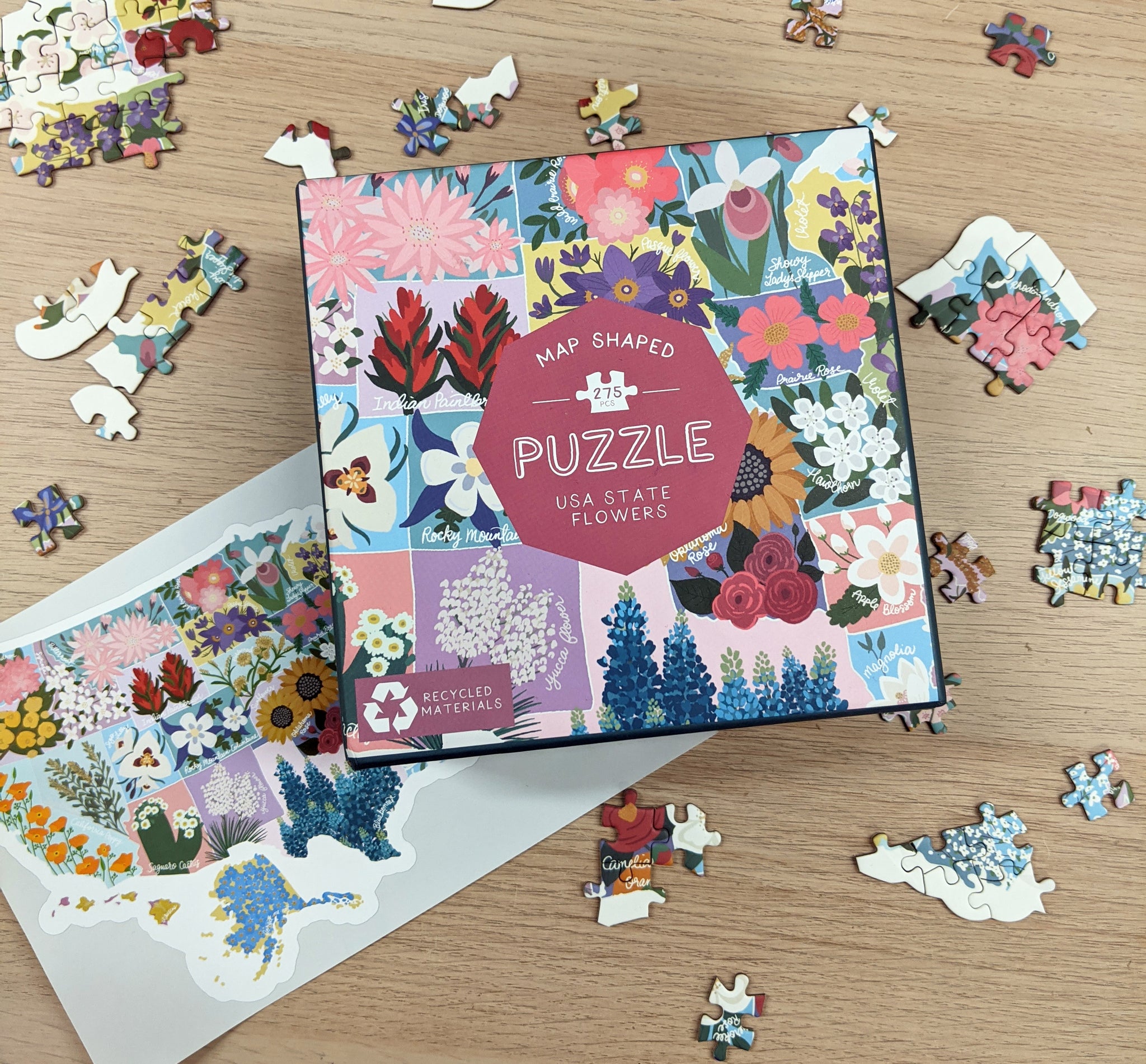 This 275 piece puzzle features one of my favorite map designs I drew of the 50 US state flowers. I absolutely loved working on this map - it was so neat to see which flowers each state chose to represent itself. You can also see commonalities between neighboring states, and those that share similar climates. The southwestern states chose native drought-resilient flora, for example. For the majority of the states, I hand-wrote the name of each flower on the artwork, so as you complete each state, you'll know what the flower's name is. I hope you enjoy solving this puzzle as much as I do!