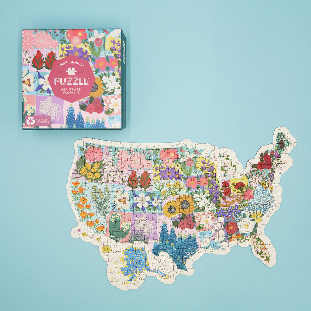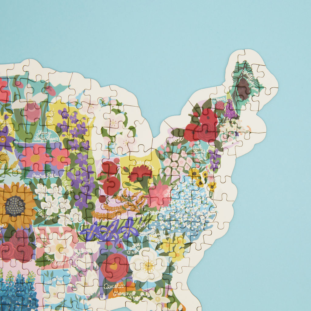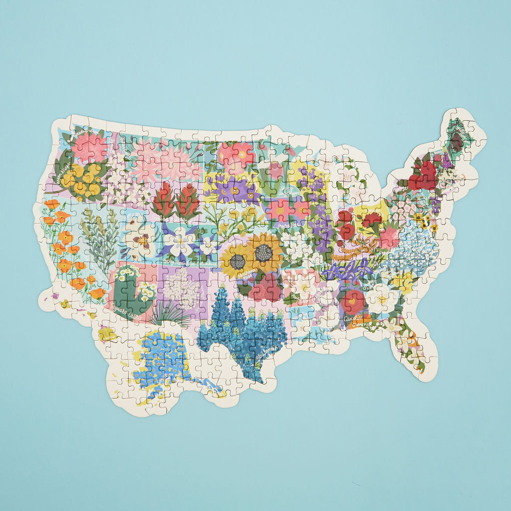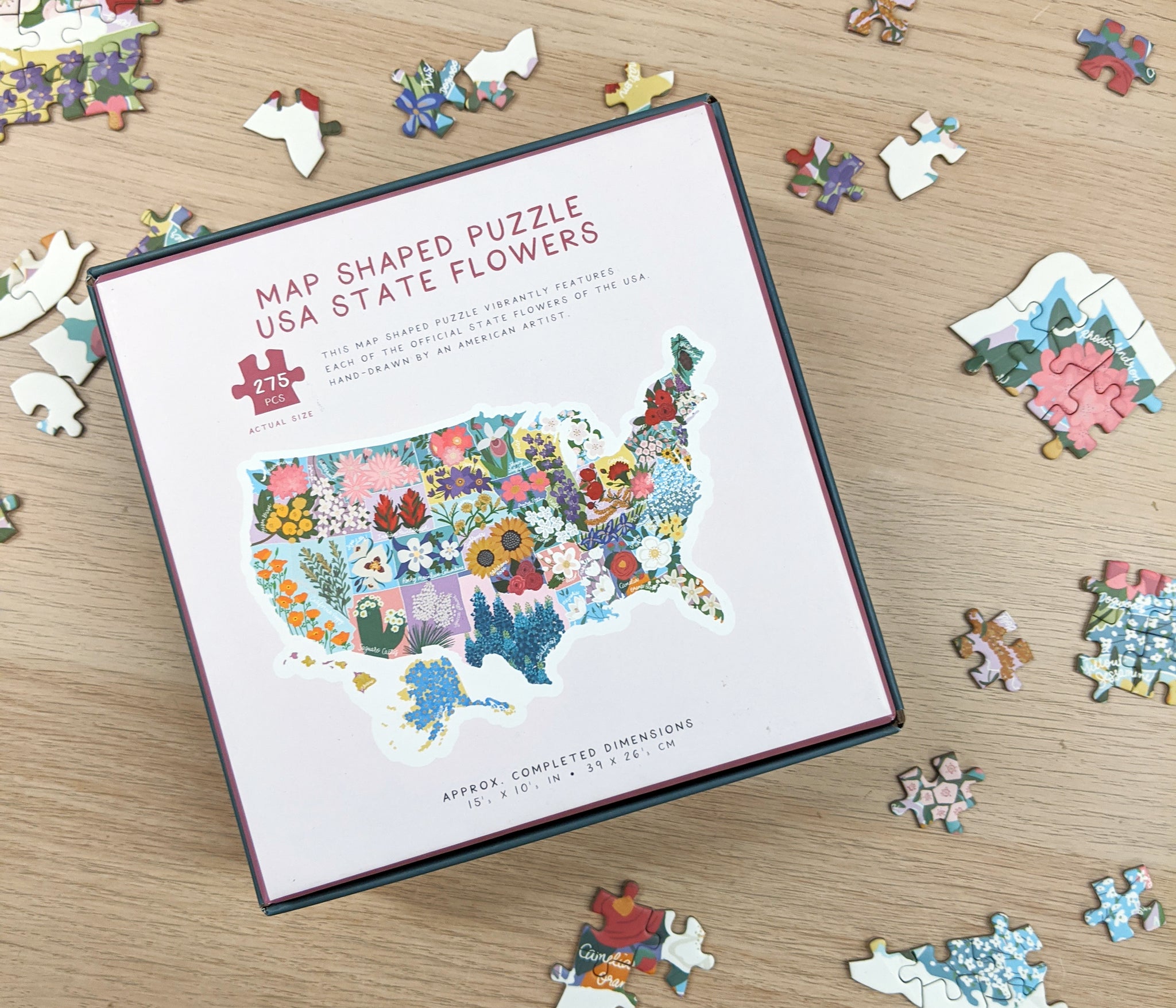 This 275 piece puzzle features one of my favorite map designs I drew of the 50 US state flowers. I absolutely loved working on this map - it was so neat to see which flowers each state chose to represent itself. You can also see commonalities between neighboring states, and those that share similar climates. The southwestern states chose native drought-resilient flora, for example. For the majority of the states, I hand-wrote the name of each flower on the artwork, so as you complete each state, you'll know what the flower's name is. I hope you enjoy solving this puzzle as much as I do!