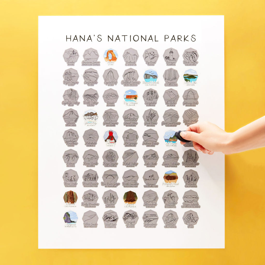 Includes 63 National Parks. Each park is hard-drawn and shaped like an octagon, making it easy to scratch more precisely. To use, simply use the included tool to scratch off the foil over states and national parks you've visited.