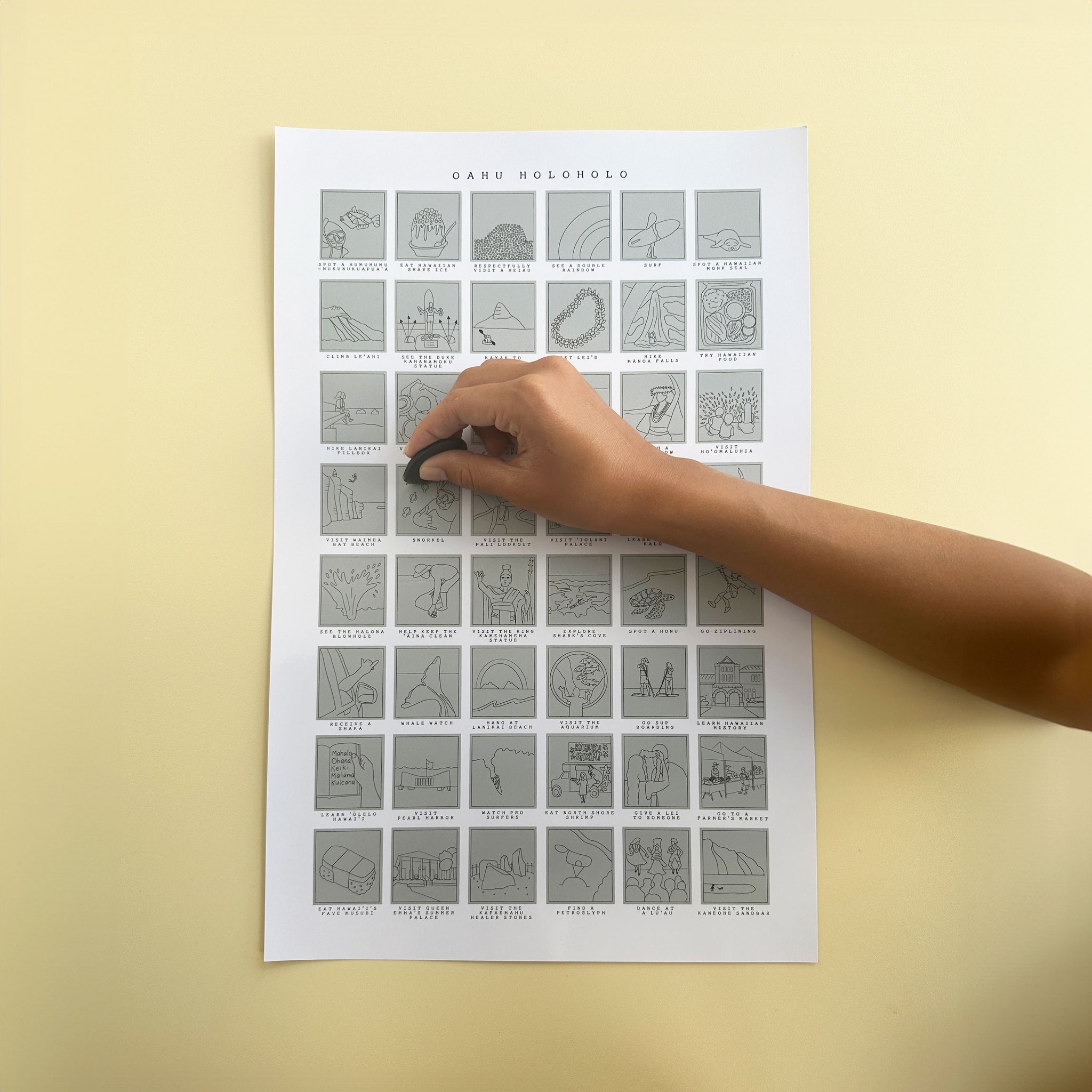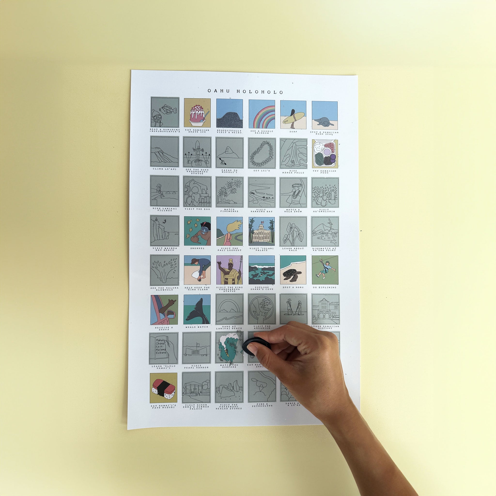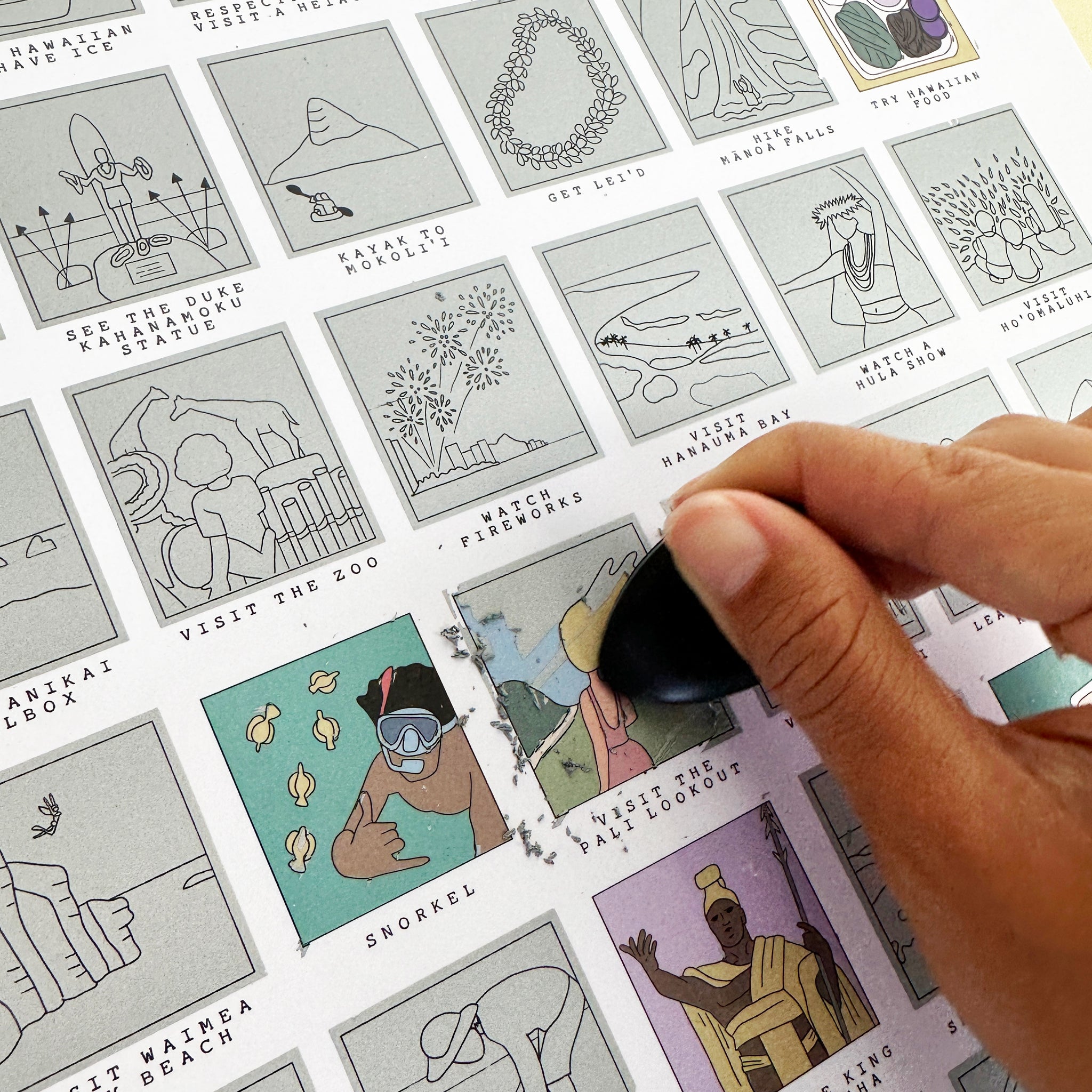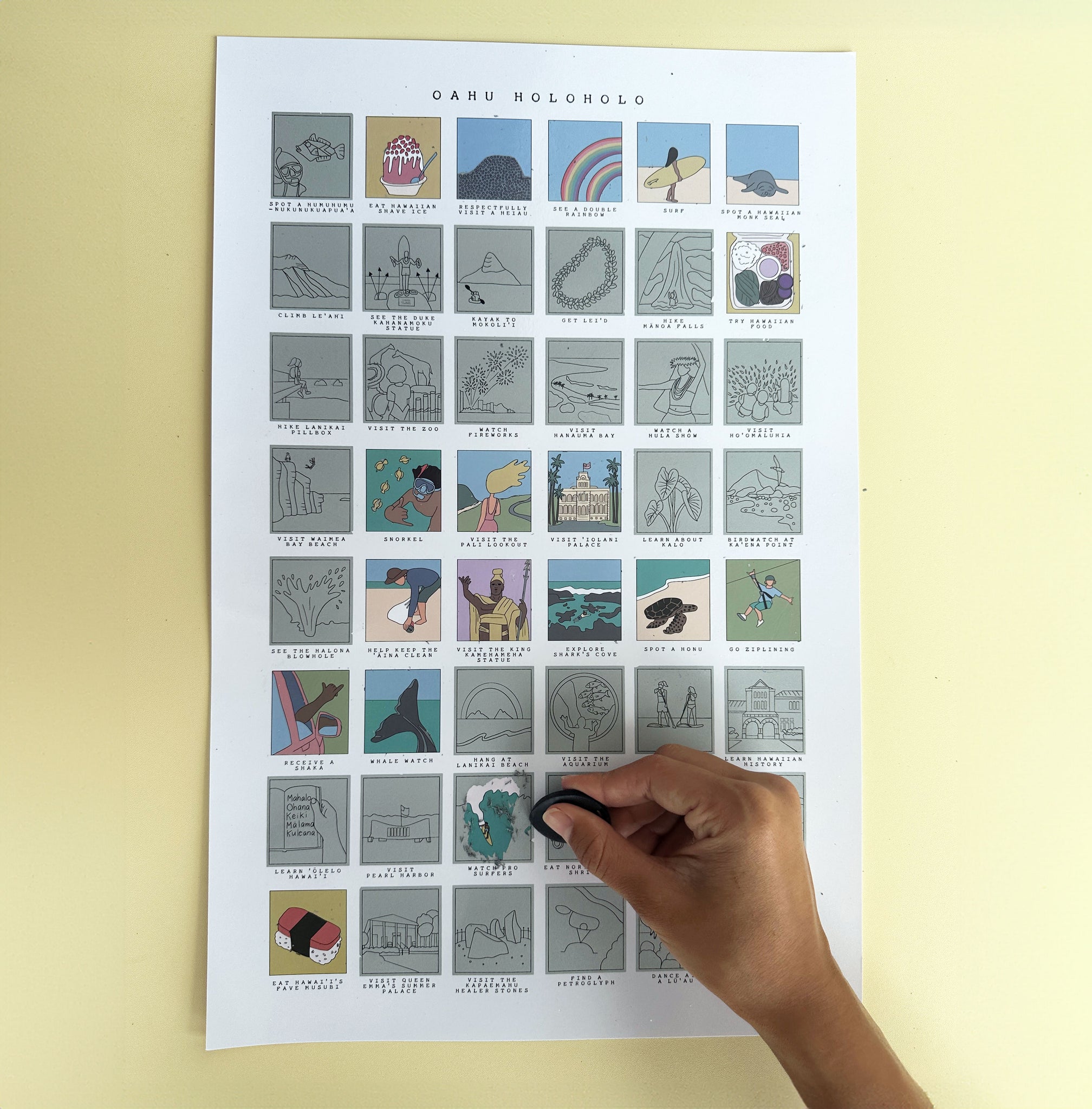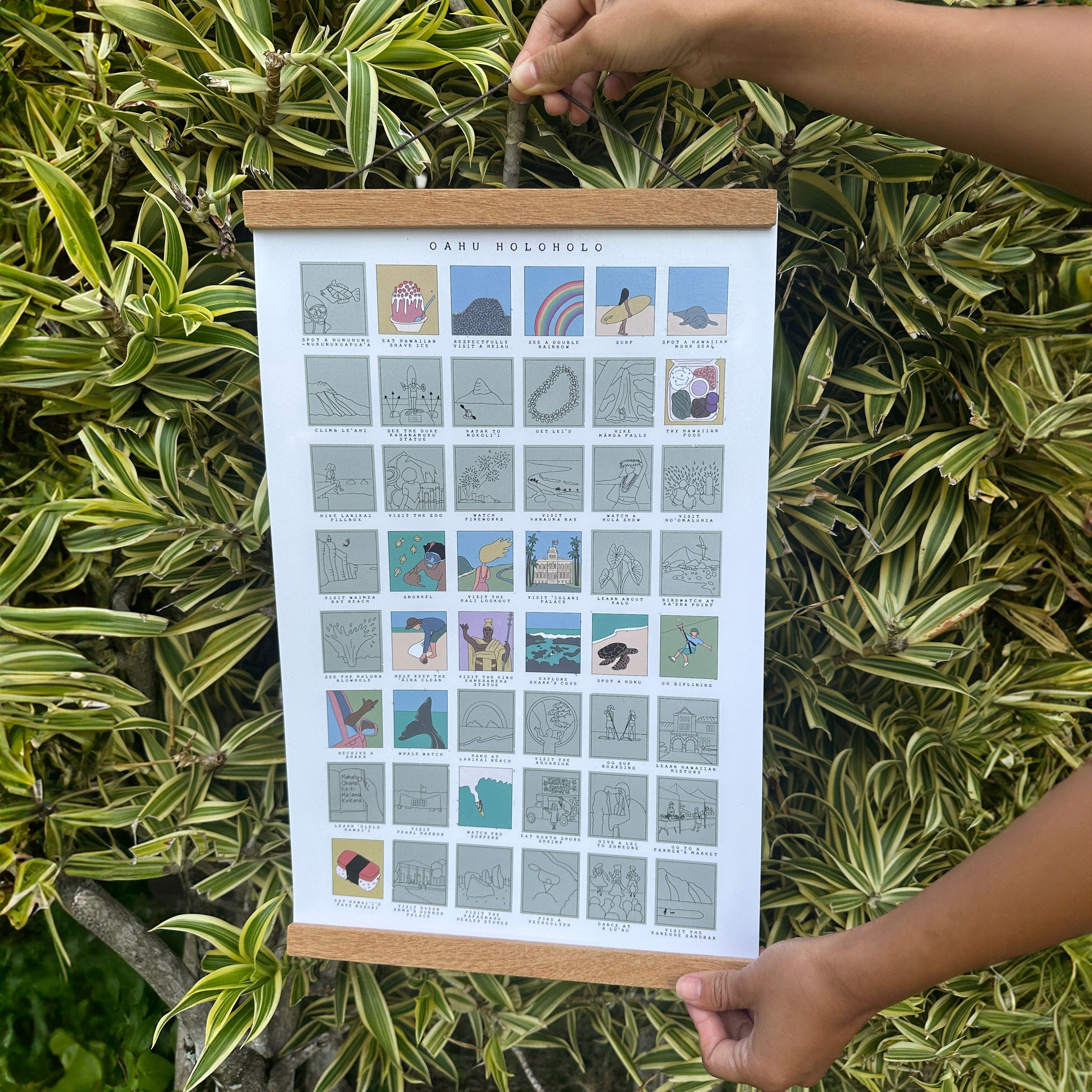 "Holoholo" in Hawaiian means to cruise, and that's exactly what this 11x17" scratch print invites you to do! Features 48 family-friendly Oahu Adventures hand illustrated by yours truly. I used native Hawaiian words for some of the landmarks like Le'ahi (Diamond Head), and Mokoli'i (Chinaman's Hat) to help promote 'Ōlelo Hawai'i (Hawaiian language).