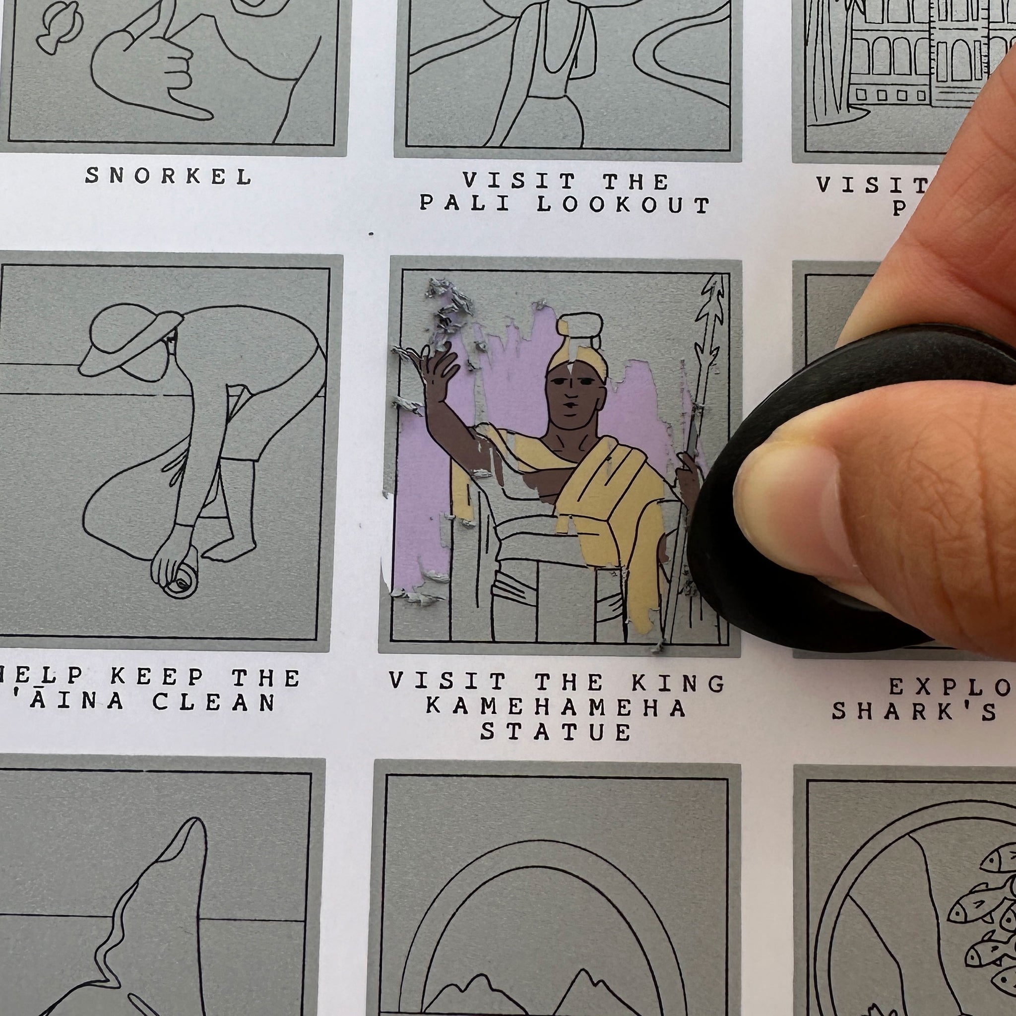 Use the included tool to remove the silver foil over what you've done, and little by little, your print will uncover the beachy hues hidden underneath... and you've got yourself a one-of-a-kind art piece to keep track of your Oahu adventures. Perfect for both local and visiting ohana!