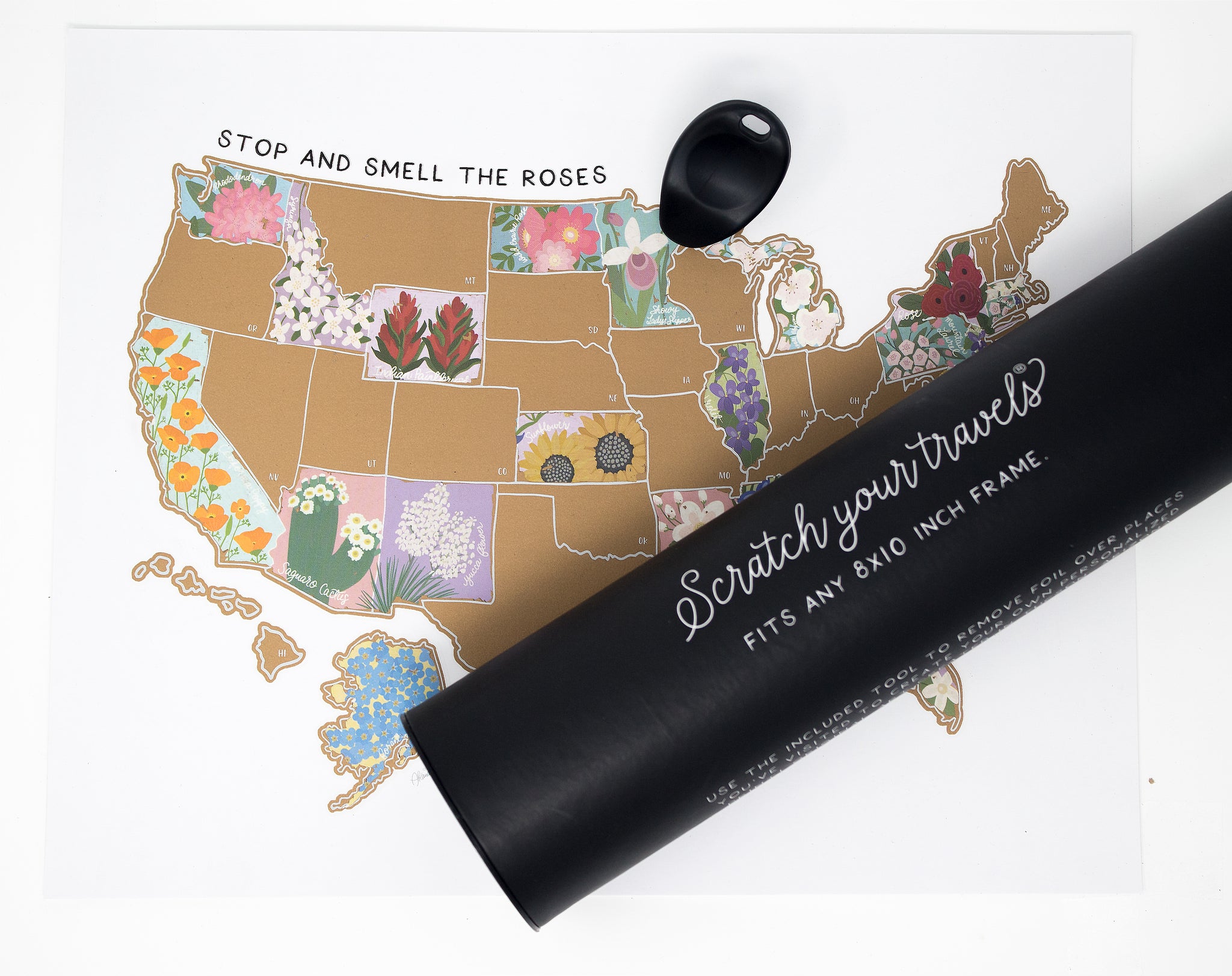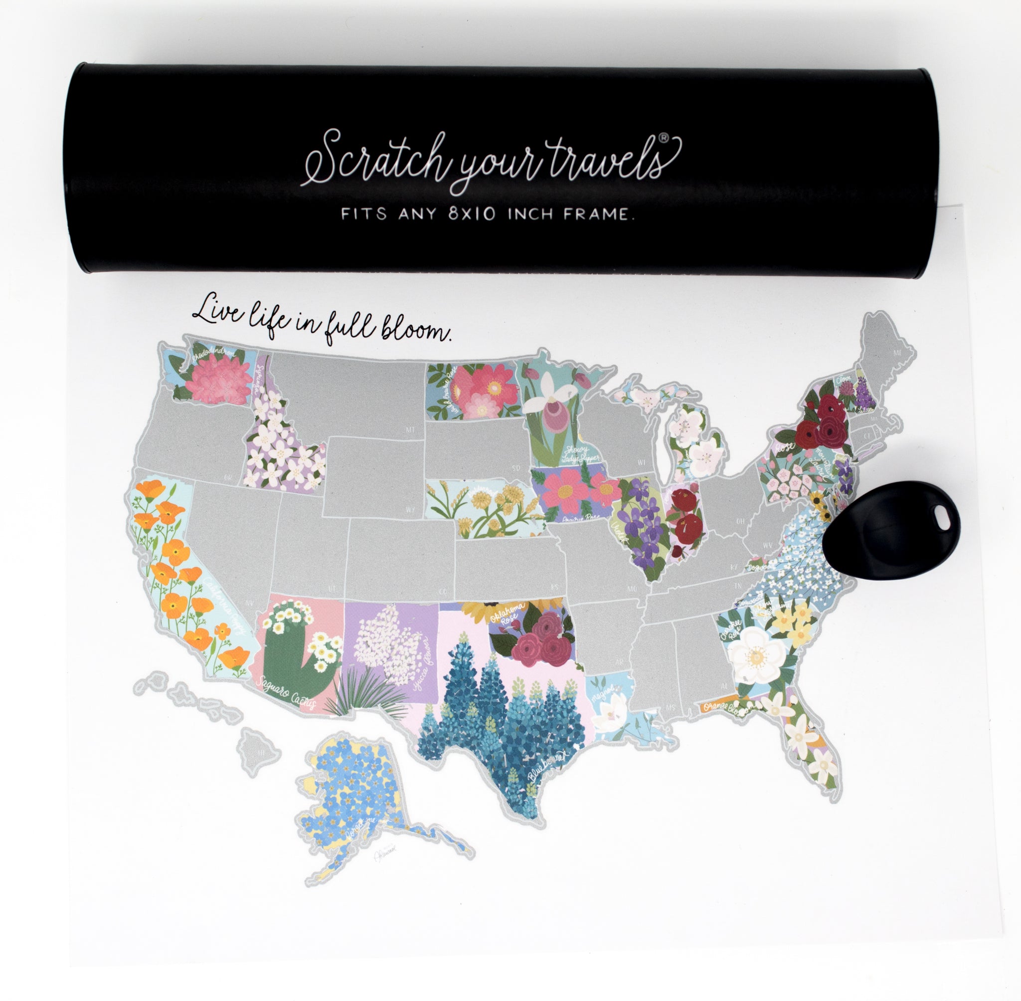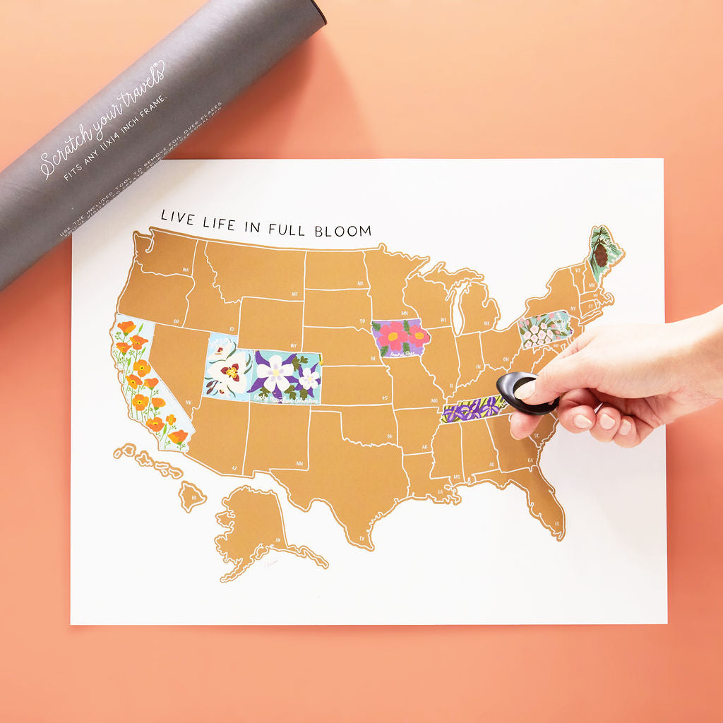 Each flower was hand-drawn by me. For the majority of the states, I hand-wrote the name of each flower on the artwork, so as you scratch off each state, you'll know what the flower's name is. Each map will come rolled in its own tube along with an instruction sheet and scratching tool that's very comfortable to use!