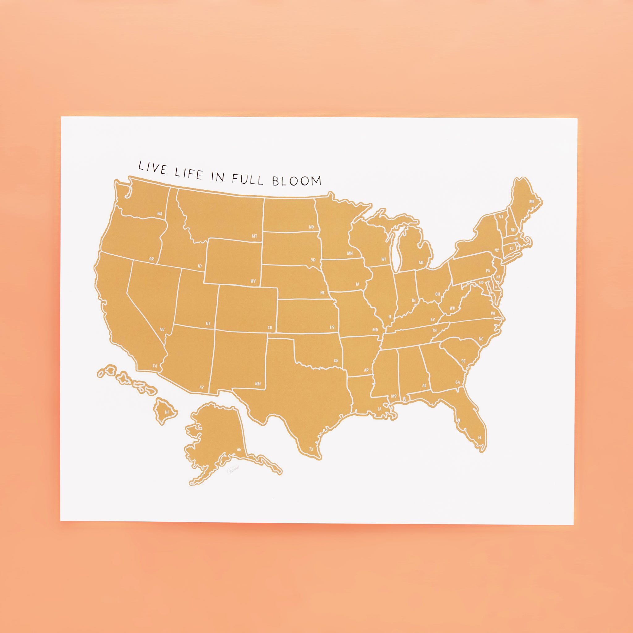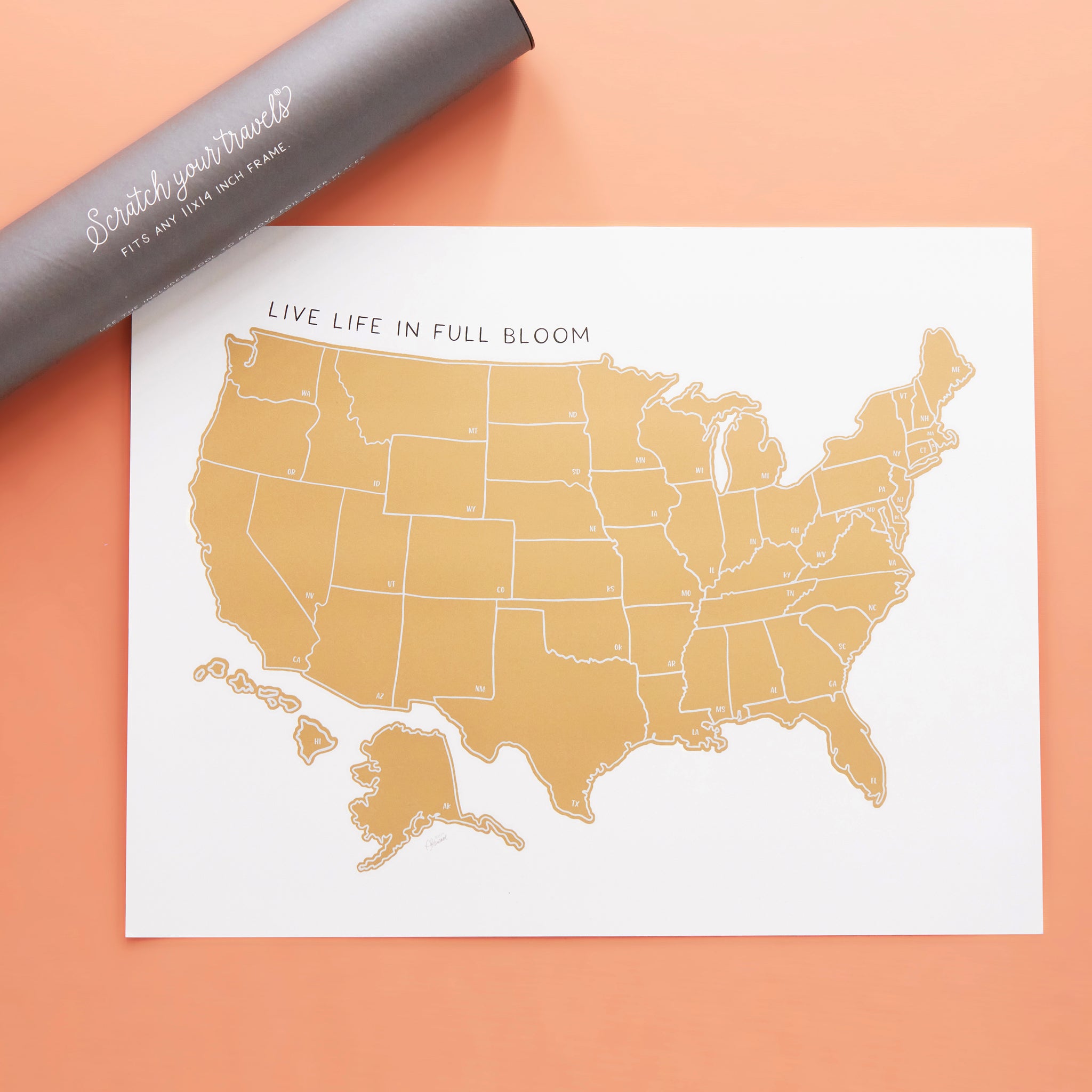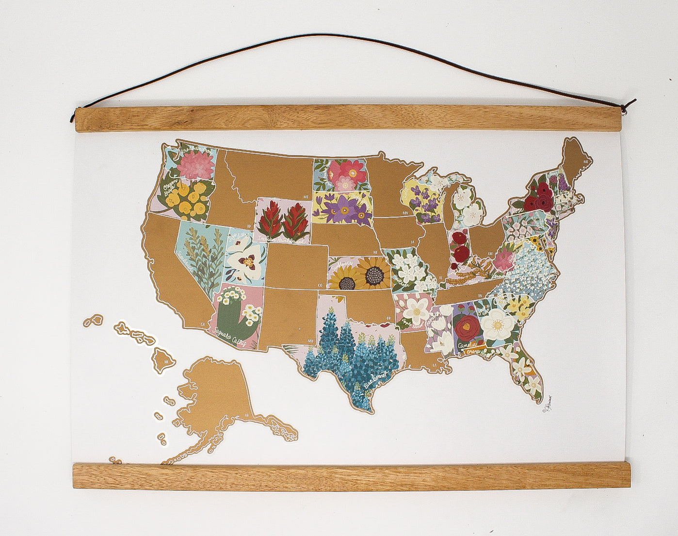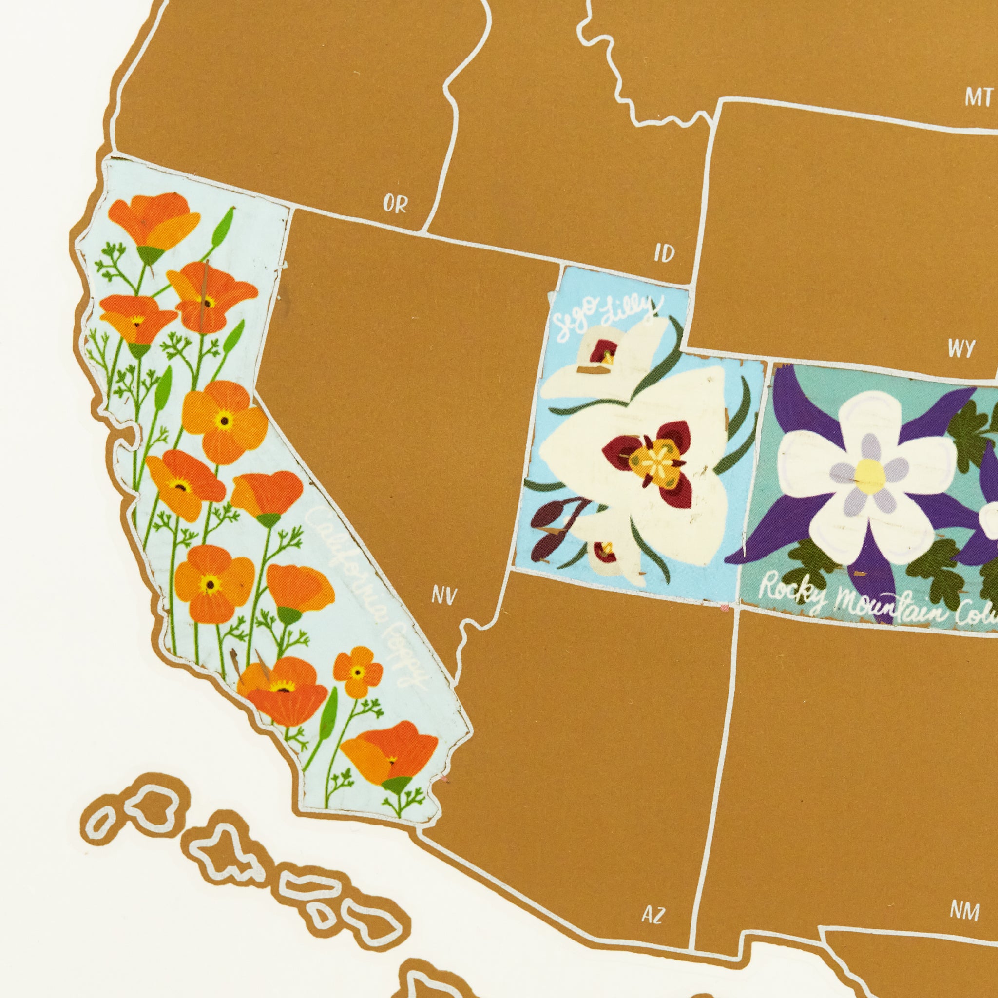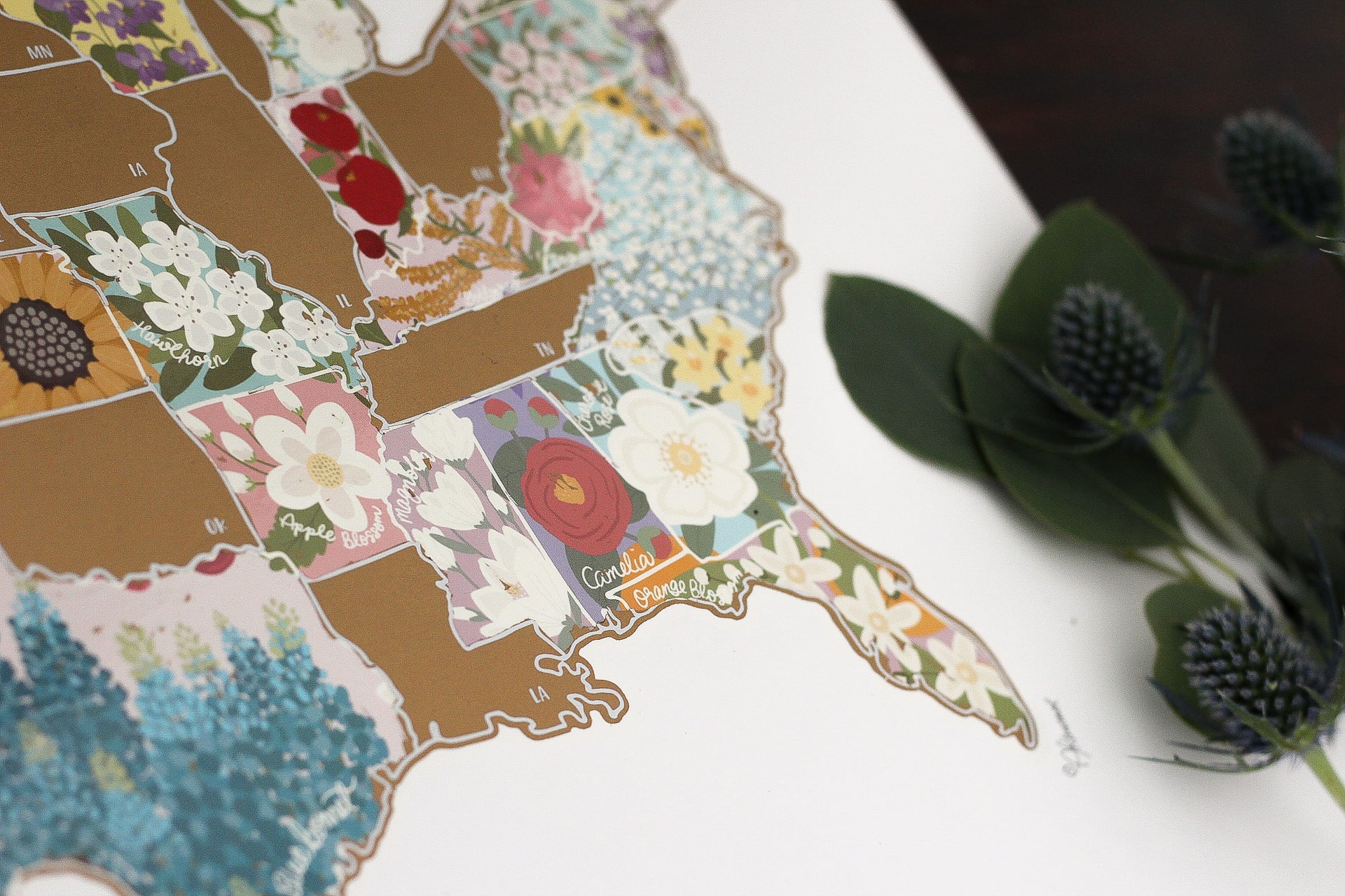 Each flower was hand-drawn by me. For the majority of the states, I hand-wrote the name of each flower on the artwork, so as you scratch off each state, you'll know what the flower's name is. Each map will come rolled in its own tube along with an instruction sheet and scratching tool that's very comfortable to use!