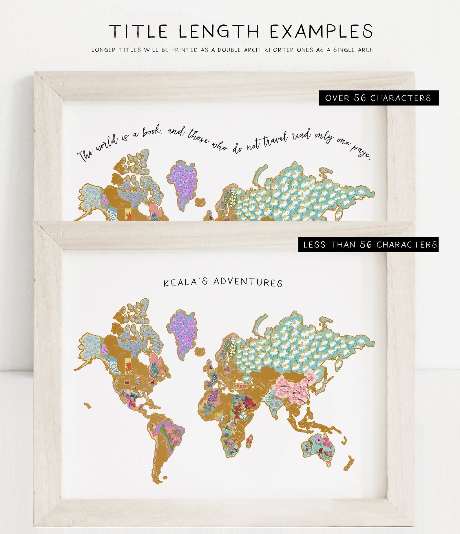 If your text is under 55 characters (space included), your title will be printed in a single arc shape. If it is longer, it will be printed as a double arch. The longer your text, the smaller the font will be.